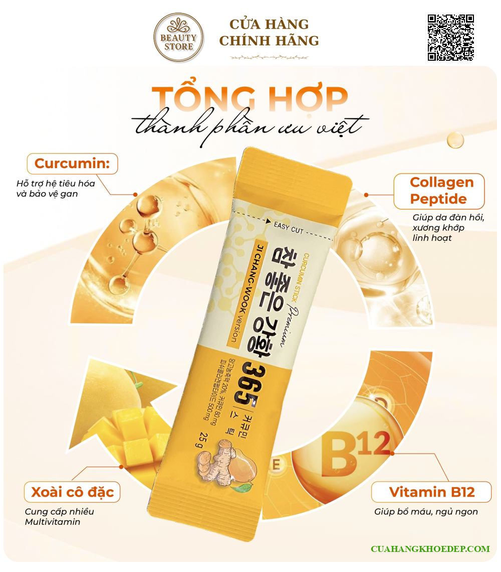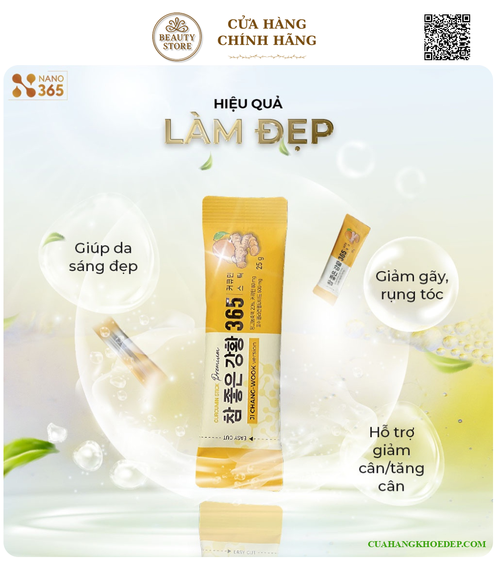 - Nano Curcumin 365 Collagen Premium Stick có chứa hàm lượng tinh bột nghệ kết hợp với các thành phần quý giá khác, sản phẩm hứa hẹn mang lại rất nhiều công dụng tuyệt vời cho sức khỏe cho người tiêu dùng cũng như giúp chị em phụ nữ có thể lấy lại sắc vóc vốn có của mình. - Nano Curcumin 365 Collagen Premium Stick được nghiên cứu và sản xuất dưới sự kiểm soát của đội ngũ bác sĩ và chuyên gia hàng đầu Hàn Quốc. Toàn bộ quy trình từ khâu lựa chọn nguyên liệu đến khi ra thành phẩm đều được kiểm nghiệm gắt gao, đảm bảo mang đến dòng sản phẩm chất lượng và an toàn nhất cho người tiêu dùng Nghệ được sản xuất trong điều kiện tốt nhất, đảm bảo vệ sinh, được nuôi trồng kỹ lưỡng từ khâu gieo hạt cho đến khi thu hoạch. Bên cạnh đó, tinh nghệ được áp dụng công nghệ Nano tiên tiến giúp chất dinh dưỡng có thể thẩm thấu sâu vào cơ thể, hỗ trợ mang lại hiệu quả cao hơn và không tốn nhiều thời gian. Với vị ngọt thanh và hương thơm ngọt ngào đến từ xoài, sản phẩm giúp người dùng cảm thấy ngon miệng hơn.